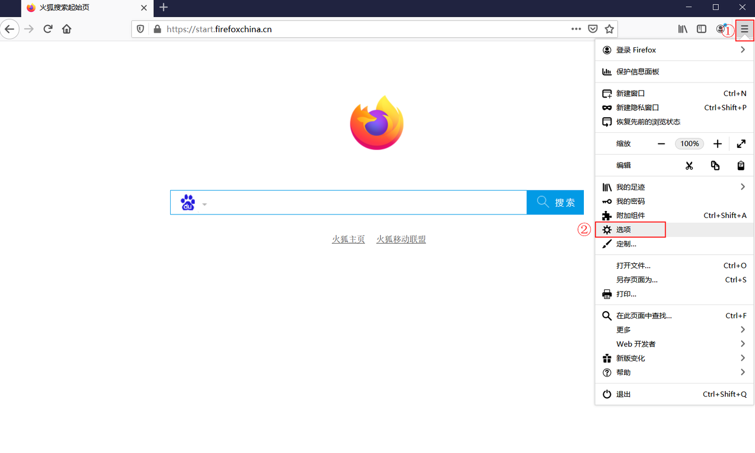 第一步:从 Firefox 菜单栏中点击 【选项】设置。