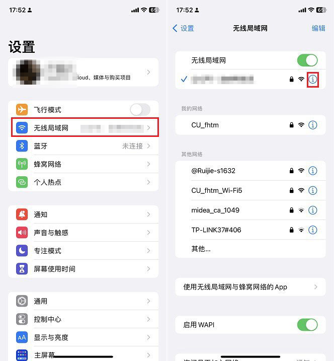1、依次进入 iPhone的 「设置」->「无线局域网」,点击已连接的WiFi网络后面的 「i」图标进入网络设置,如图所示。
