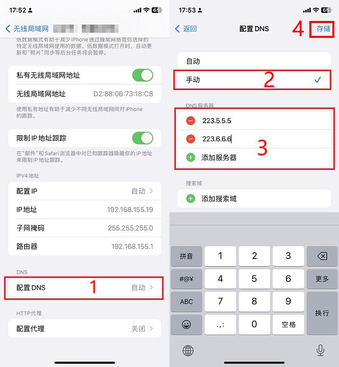 手动设置DNS一般是添加两个,第一个是首选DNS地址,第二个是备选DNS地址。上图为使用阿里公共DNS地址,你也可以根据需求换成其它DNS地址即可,添加完成后点击右上角的「存储」就完成设置了。